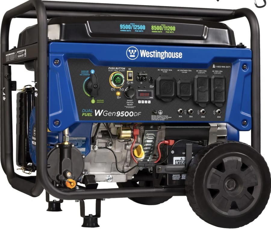 9500 watts with 30amp/50amp outlets able to power up too 4 blowers