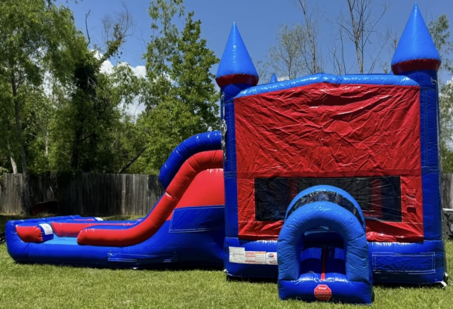 Red and Blue 5N1 combo double lane slide with inflated pool.